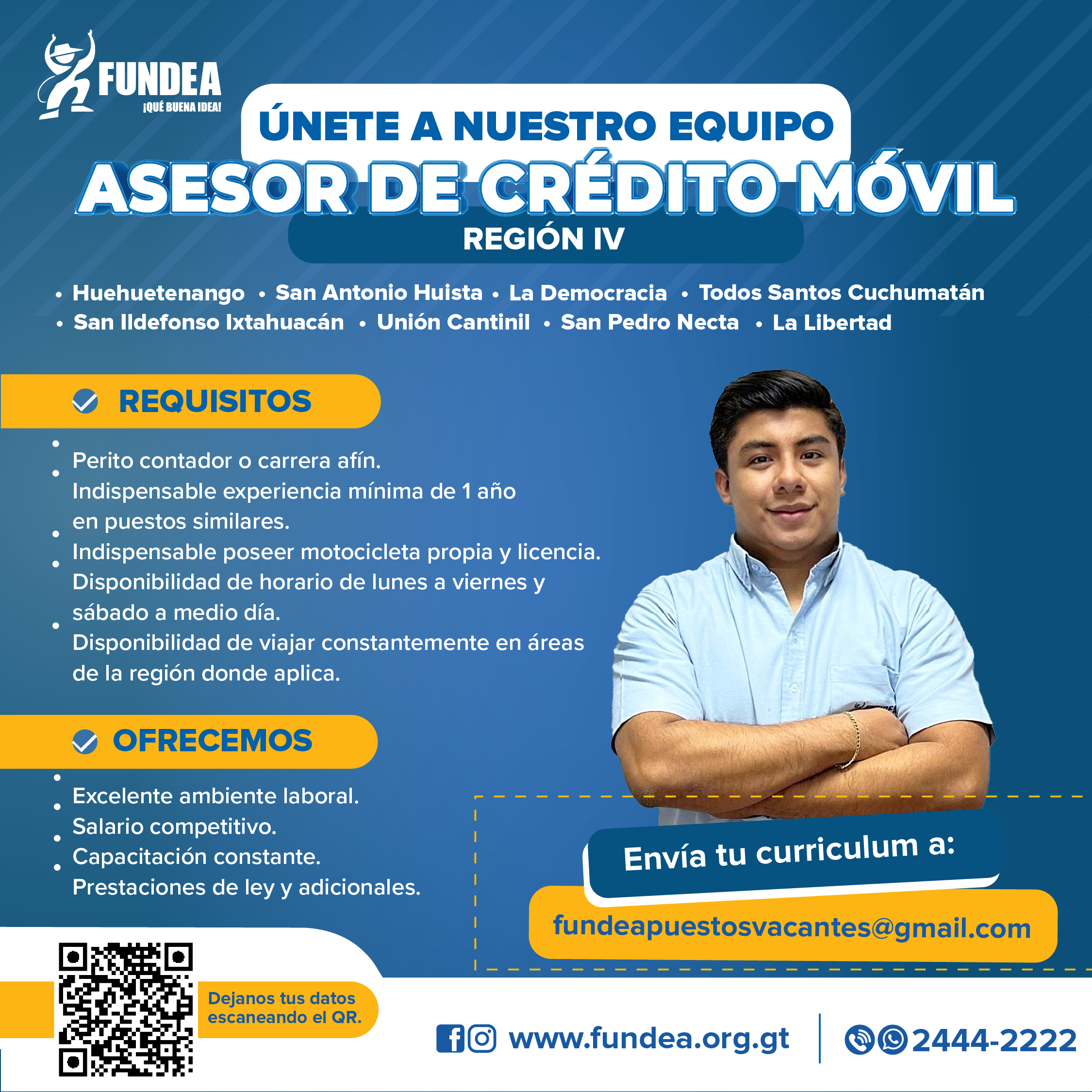 Fundea > Asesor de Crédito Móvil – Región IV (Huehuetenango, San Antonio Huista, La Democracia, Todos Santos Cuchumatán, San Ildefonso Ixtahuacán, Unión Cantinil, San Pedro Necta, La libertad).